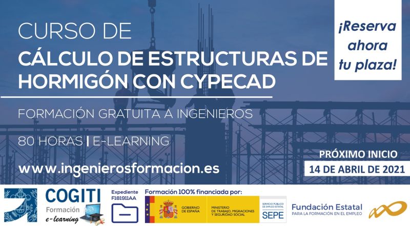Informamos que la última edición del curso subvencionado "Cálculo de estructuras de hormigón con CypeCAD" dará comienzo el miércoles 14 de abril de 2021.
